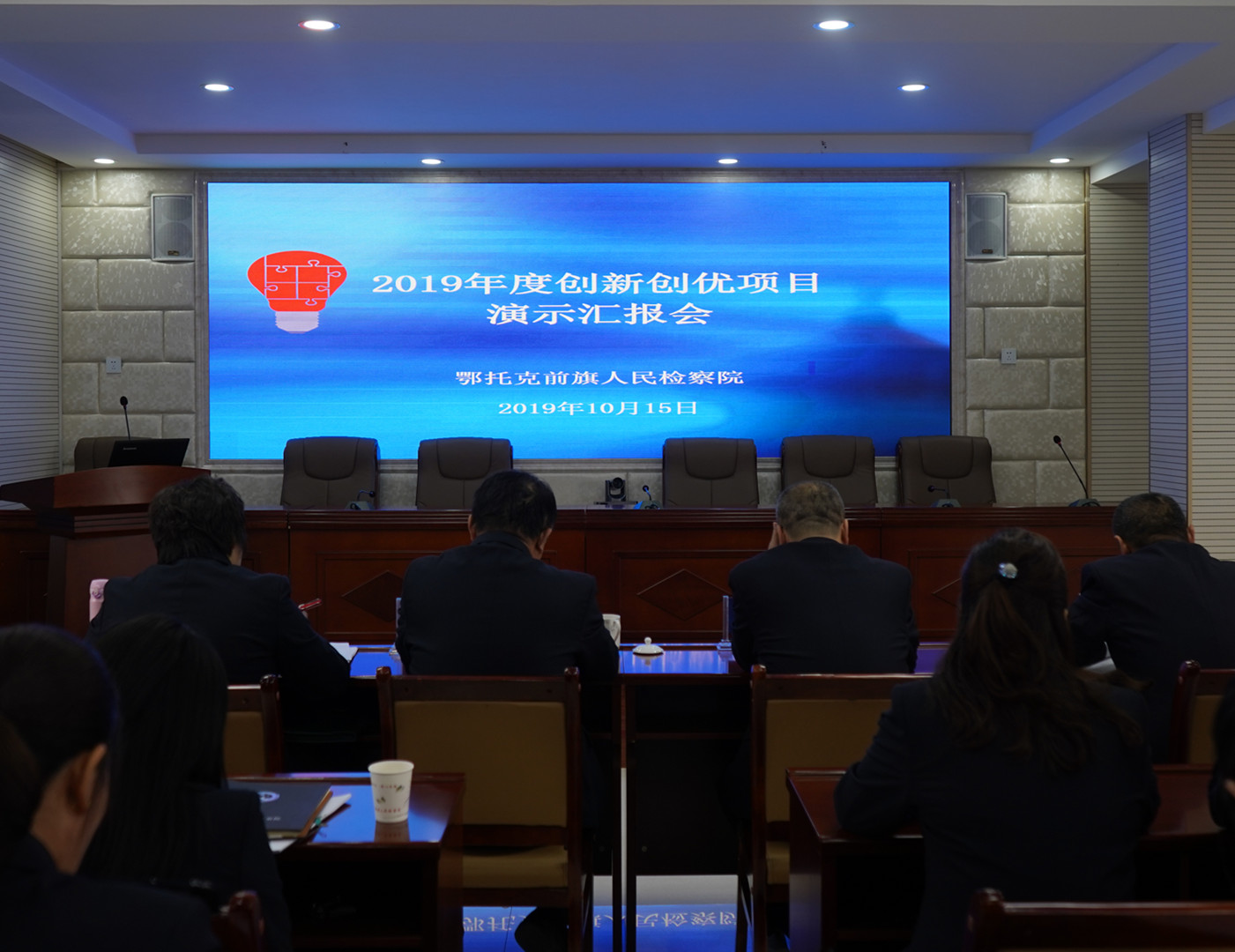 2019年以来,鄂前旗检察院立足破解制约检察工作发展的瓶颈问题,以创新创优工作为抓手,引导全体检察人员在严格遵守法律法规和工作规范的前提下,切实转变工作作风,自觉树立发展、创新的工作理念,着力营造浓厚的创新创优氛围。为进一步培育检察工作亮点,提升检察工作质效,深化创新创优成效,2019年10月15日下午,鄂前旗检察院组织召开了2019年创新创优项目演示汇报会。院党组成员、专委及全体干警参加了会议。 经过层层筛选,此次活动共有6个部门的6个项目进行了演示汇报。各项目所属部门汇报人按抽签顺序依次对本部门2019年度创新创优项目进行了演示汇报。